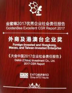 “金蜜蜂企業(yè)社會責(zé)任報(bào)告評估體系”,從結(jié)構(gòu)完整性、內(nèi)容實(shí)質(zhì)性、績效可比性、報(bào)告可信度、可讀性、創(chuàng)新性等六個維度對《大金中國2017企業(yè)社會責(zé)任報(bào)告》高度認(rèn)可,認(rèn)為“報(bào)告披露了大金中國將自身發(fā)展理念與聯(lián)合國2030可持續(xù)發(fā)展目標(biāo)深度融合,以‘發(fā)掘下一個需求,創(chuàng)造新的價值’為宗旨,攜手利益相關(guān)方創(chuàng)造經(jīng)濟(jì)、社會、環(huán)境綜合價值的行動。是一份高水準(zhǔn)的在華外商投資企業(yè)社會責(zé)任報(bào)告”。
